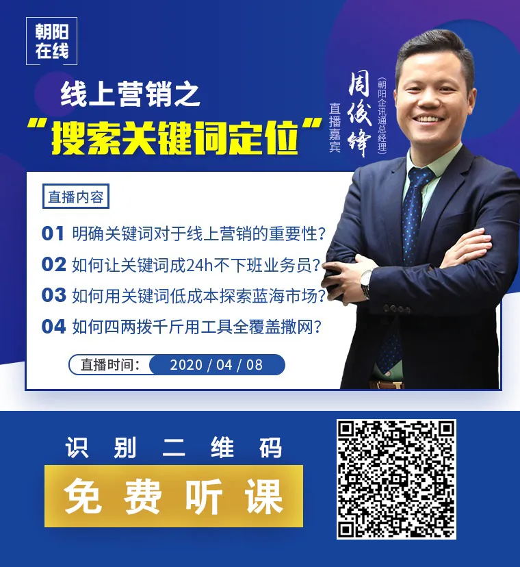 朝陽(yáng)在線全面啟動(dòng)免費(fèi)線上營(yíng)銷課程直播,這些課程幫助大部分企業(yè)解決“線上營(yíng)銷、盈利模式、如何布局遇到的問(wèn)題。不僅適合互聯(lián)網(wǎng)運(yùn)營(yíng)、創(chuàng)業(yè)者們,更適合個(gè)人及商家學(xué)習(xí)。